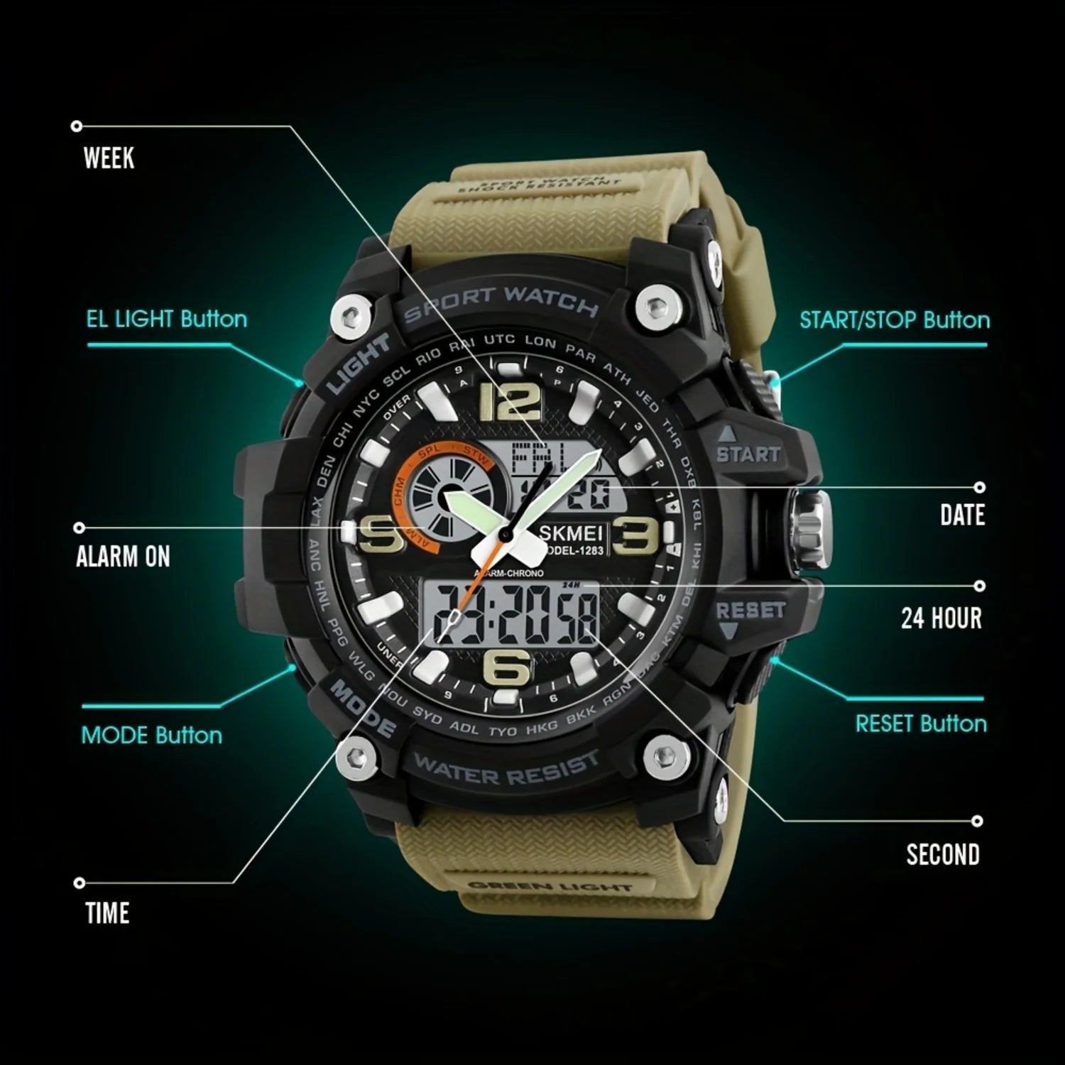 1. Stay prepared for any adventure with this Waterproof Dual Time Electronic Watch, perfect for keeping track of time in multiple locations without worrying about water damage.